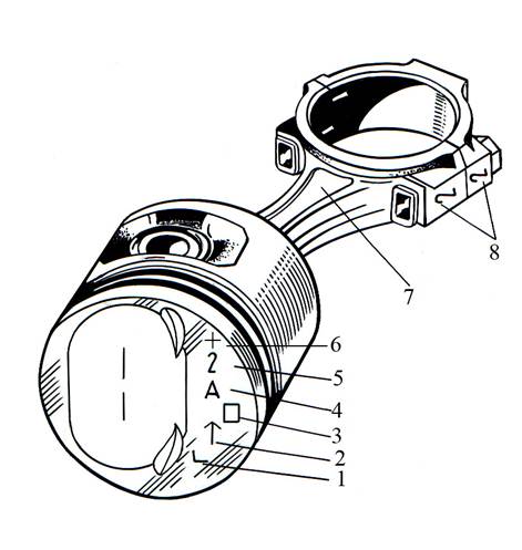 Рис. 4.16. Маркировка поршней и шатунов в автомобилях: 1,6 – группа поршня по массе; 2 – стрелка для ориентации поршня в цилиндре (вперед к радиатору); 3 – ремонтный размер; 4 – класс поршня по диаметру; 5 – класс поршня по диаметру отверстия под поршневой палец; 7 – отверстие для выхода масла; 8 – номер цилиндра