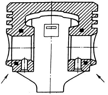 На поршне может также наносится модификация двигателя, на который устанавливается поршень; дата производства поршня; обозначение размерной группы по высоте (для дизельных двигателей) и др. По наружному диаметру поршни, как и цилиндры, в целях селективной сборки, разделяются на несколько классов (например, для автомобилей ВАЗ-2108, ВАЗ-2109 - 5 классов (А, В, С, D, Е) с шагом 0,01 мм; “Крайслер”, “Пежо” - 4 класса (А, В, С, D); “Тойота” - 5 классов (1, 2, 3, 4, 5). Поршни могут быть разделены по диаметру также и на группы: номинальный диаметр, первая и последующие размерные группы (в автомобилях “Ауди 80Д”, “Фольксваген”, “Сузуки”). Поршни дизельных двигателей некоторых автомобилей, например, Фольксваген, могут отличаться по высоте, поэтому их нумеруют для правильной установки в цилиндры. Нумерация ½ означает что поршень может быть установлен в первый или второй цилиндр, ¾ в третий или четвертый цилиндр. Отдельные фирмы, например, Рено делят шатуны и поршни по размеру на группы. В зависимости от размерной группы, расстояние между отверстиями верхней и нижней головок шатуна и отверстием под поршневой палец и головкой поршня различается. Размерная группа поршня указывается на его головке, а размерная группа шатуна – на его стороне. Наружная поверхность поршня имеет сложную форму, поэтому измерять его диаметр следует только в плоскости, перпендикулярной к поршневому пальцу, на расстоянии 40,0…51,5 мм от днища поршня или от нижнего края его юбки (14,0…35,0 мм) в зависимости от модели двигателя (см. рис. 4.10). Отверстия под поршневой палец также могут подразделяться на несколько классов по диаметру, как правило с шагом 0,004 мм. Класс диаметра поршня и отверстия под поршневой палец указаны на днище поршня. В зависимости от массы поршни сортируются по группам. Например, для автомобилей ВАЗ-2109 это три группы: нормальная, увеличенная на 5 г и уменьшенная на 5 г. Этим группам соответствует маркировка на днище поршня: “Г”, “+” или “-”. Аналогичная маркировка применяется и для других двигателей, например БМВ. Если отсутствует комплект поршней по массе, можно подогнать ее, равномерно удалив металл напильником или фрезой с двух сторон на нижней наружной стороне бобышек (рис.). Разница между поршнями по массе не должна превышать 4 г.