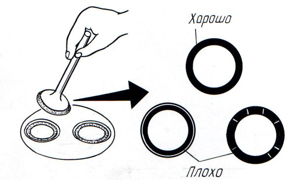 Предельные размеры указываются для того, чтобы при обработке не был снят слой твердого сплава, нанесенный на рабочую часть клапана. Угол шлифования фаски клапана, как правило, равен 30 или 45º. Причиной неудовлетворительной работы двигателя может быть неплотное прилегание клапанов к гнездам. Нарушение герметичности клапанов при нормальном тепловом зазоре в клапанном механизме и хорошем техническом состоянии систем питания и зажигания сопровождается потерей мощности двигателя, перебоями в его работе и характерными хлопками в глушителе. В этом случае, а также при установке новых клапанов производят притирку рабочей фаски клапана к его седлу. Для проверки пятна контакта рабочей фаски клапана и его седла на фаску седла наносят тонкий слой свинцового сурика. Клапан устанавливают на место, после легкого прижатия к седлу снимают, затем проверяют отпечаток на его фаске (рис. 4.36).