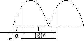 Вращая поочередно рукоятки резисторов R1 и R2 по часовой стрелке, зафиксировать появление напряжения на приборе ИП и соответствующей временной диаграммы на экране осциллографа. Это напряжение соответствует минимальному углу управления amin. Отсчет угла управления произвести по осциллографу (см.рис.6). Для вычисления угла управления a следует измерить длины отрезков L и l. Угол a определяется по формуле: