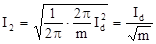 По среднему и максимальному значениям токов и максимальному значению обратного напряжения выбираются диоды. Действующее значение напряжения вторичной обмотки трансформатора определяется из уравнения (2). Действующее значение фазного тока в этой обмотке, (рис.1,г,д,е-пунктирная линия), если считать, что ток диода, а следовательно, и ток во вторичной обмотке трансформатора имеют вид прямоугольника с высотой Id и с основанием (в общем случае) 2p/m, находим из уравнения: