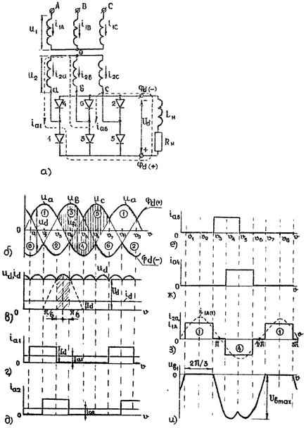 В схеме с выводом нулевой точки трансформатора (рис.1, а) аноды трех диодов присоединены к концам фаз вторичных обмоток трансформатора. Катоды диодов соединены вместе. Диоды поочередно пропускают ток в цепь нагрузки. Общая точка катодов диодов служит положительным полюсом для цепи нагрузки, а нулевая точка вторичной обмотки трансформатора - отрицательным полюсом. Работа схемы иллюстрируется временными диаграммами, приведенными на рис.1, б-ж. (Рассмотрен режим чисто активной нагрузки). Из диаграмм вторичных фазных напряжений (рис.1, б) видно, что в течение 2.π/3 напряжение одной фазы относительно нулевой точки трансформатора выше напряжений двух других фаз. Следовательно, в любой момент времени ток пропускает