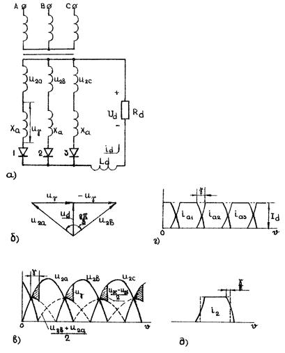 Рисунок 3 – Схема трехфазного нулевого выпрямителя с учетом индуктивности рассеяния трансформатора (а); векторная (б) и временные диаграммы (в-д), учитывающие явление коммутации