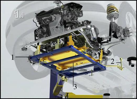 Рис. Положение рам при установке двигателя и коробки передач: 1 – основная рама; 2 – центрирующая рама; 3 – стержень Применение комплекса обеспечивает точность установки агрегатов автомобиля, заданной при его производстве, чтобы избежать нежелательных напряжений, вызванных неправильной сборкой агрегатов автомобиля и приводящих к появлению шумов и вибраций при движении автомобиля. Комплекс может использоваться для различных марок и вариантов автомобилей, указанных в технической документации. Для монтажа демонтажа агрегатов основная и выравнивающая рамы с установленными агрегатами поднимаются (опускаются) с помощью подъемника. При монтаже агрегатов основная рама устанавливается относительно центра тяжести агрегата по размерам, указанным в технической документации. После подъема агрегата на необходимую высоту производится его центрирования по технологическим картам относительно специальных технологических отверстий (базовых точек) в днище кузова и корпусе переднего моста, предусмотренных при изготовлении автомобиля. Для этого на центрирующую плиту и в технологические отверстия вставляются стержни, держатели и подпорки из комплекта инструментов. Выравнивание положения переднего моста производится относительно днища кузова, а двигателя и коробки передач относительно корпуса переднего моста с помощью контрольных и выравнивающих калибров. После выравнивания производятся крепежные работы для установки агрегатов. Date: 2015-05-04; view: 682; Нарушение авторских прав |