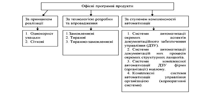Програмне забезпечення можна поділити на дві групи відповідно з двома складовими діловодства: - програмні продукти для автоматизації документування, тобто автоматизація процесів складання, оформлення і виготовлення документів; - програмні продукти для автоматизації процесів роботи з документами і інформацією, що в них міститься. В даний час для створення документів використовують виключно текстові і табличні редактори (процесори) провідних фірм-виробників (наприклад, Місгозой Ойїсе). Програмні продукти (програмне забезпечення) класифікуються на різні види відповідно з ознаками (рис. 9.2).