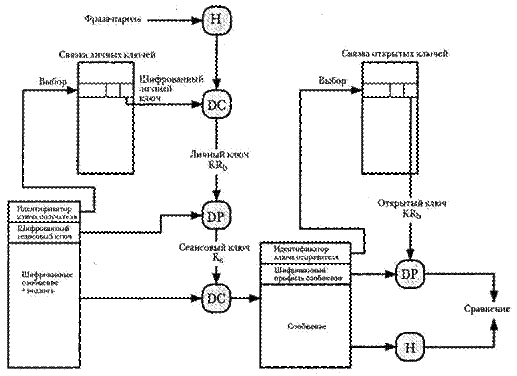 Рисунок 10.4 - Общая структура связок личных и открытых ключей Связка личных ключей может быть индексирована либо по полю Идентификатор пользователя, либо по полю Идентификатор ключа; цель такой индексации мы выясним позже. Хотя предполагается, что связка личных ключей должна храниться только на машине пользователя, создавшего и владеющего соответствующими парами ключей и что она должна быть доступна только этому пользователю, имеет смысл сделать значения личных ключей защищенными настолько, насколько это возможно. Соответственно, сам личный ключ в открытом виде в связке ключей не хранится, а шифруется с помощью CAST-128 (или IDEA, или 3DES). При этом используется следующая процедура. 1. Пользователь выбирает фразу-пароль, которая будет служить для шифрования личных ключей. 2. Когда система с помощью RSA генерирует новую пару открытого/личного ключей, она требует от пользователя указать такую фразу-пароль. Из нее с помощью SHA-1 генерируется 160-битовый хэш-код, а затем пароль удаляется. 3. Система шифрует личный ключ с помощью CAST-128, используя 128 битов хэш-кода в качестве ключа. Хэш-код затем удаляется, а шифрованный личный ключ сохраняется в связке личных ключей. Впоследствии, когда пользователь обращается к связке личных ключей, чтобы извлечь личный ключ, ему придется снова указать фразу-пароль. PGP извлечет шифрованный личный ключ, вычислит хэш-код пароля и дешифрует личный ключ с помощью CAST-128 с данным хэш-кодом. Это очень компактная и эффективная схема. Как и в любой основанной на паролях системе, защищенность всей системы зависит от защищенности пароля. Чтобы не поддаться искушению записать пароль, пользователь должен использовать такую парольную фразу, которую угадать нелегко, а запомнить — просто. На рис. 4.4 показана и общая структура связки открытых ключей. Эта структура данных позволяет хранить открытые ключи других пользователей, известных данному. Пока что давайте проигнорируем некоторые поля, указан-ные в таблице, и опишем только часть из них. ■ Метка даты-времени.Дата и время создания данной записи. ■ Идентификатор ключа. Младшие64разряда открытого ключа даннойзаписи. ■ Открытый ключ. Открытый ключ данной записи. ■ Идентификатор пользователя. Владелец данного ключа.С однимоткрытым ключом можно связать несколько идентификаторов пользователя. Связка открытых ключей может быть индексирована либо по полю Идентификатор пользователя, либо по полю Идентификатор ключа; цель такой индексации мы выясним позже. Теперь мы можем показать, как эти связки ключей применяются при передаче и приеме сообщений. Для простоты в следующем примере мы проигнорируем сжатие и преобразование в формат radix-64. Сначала рассмотрим передачу сообщения (рис. 10.5) и предположим, что сообщение должно быть и подписано, и зашифровано. Посылающий сообщение объект PGP выполняет следующие шаги.