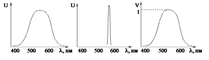 Рис. 1. Рис. 2. Поскольку, как уже отмечалось, одной из причин выделения раздела оптики является воздействие света на органы чувств, важным является вопрос о восприятии глазом света в различных спектральных диапазонах. Данная характеристика носит название кривой относительной спектральной чувствительности глаза. Данная характеристика индивидуальна. Ее примерный вид изображен на рис. 2. По виду она близка к кривой спектральной плотности солнечного света. Ее смысл заключается в том, что по оси Y откладывается величина V(l), обратно пропорциональная величине потока световой энергии, вызывающая одинаковые зрительные ощущения V(l1)/V(l2) = U(l2)/U(l1). При этом максимальное значение функции V(l) принимается за 1.