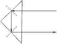 На грань а оба раза луч падает по нормали и проходит не преломляясь. На грани б и в луч падает под углом 45°, что для стекла и кварца больше критического угла и там происходит полное внутреннее отражение. Т. о. луч меняет свое направление на противоположное. Применение призмы в бинокле показано на рис. 6, б.