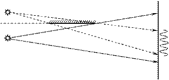 В частном случае, когда I1 = I2 = I0 в точках, где cosd = 1 (воны находятся в одной фазе, рис. 2, б) амплитуда волны будет удваиваться, а интенсивность будет в четыре раза больше I0, а в точках, где cosd = 0 (волны в противофазе, рис. 2. в) амплитуда и интенсивность будут равны нулю.