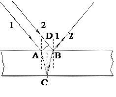 Отдельно рассмотрим интерференцию света при отражении от тонких пленок или пластинок. В этом случае при падении плоской (идущей от удаленного источника) световой волны происходит отражение от двух поверхностей данной пластинки. При определенных условиях эти отраженные лучи могут интерферировать. Ход лучей в этом случае приведен на рис. 6. Луч 1 преломляется в точке А, отражается от противоположной поверхности пленки в точке С и вторично преломляется в точке В. Оптический путь его равен длине пути АСД (s1) умноженному на оптическую плотность пленки. Общая разность хода будет складываться из оптического пути первого луча в пластине и второго луча в воздухе DB (s2):