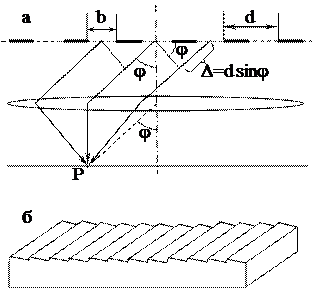 Дифракционная решетка представляет собой совокупность большого числа одинаковых, отстоящих друг от друга на одно и то же расстояние щелей (рис. 11, а). Расстояние d между серединами соседних щелей называется периодом решетки. Число щелей на 1 мм решетки может достигать 1000, а общее число – 100000. Широкое применение находят отражательные решетки, которые получают нанося на отполированную поверхность металла параллельные штрихи тонким алмазным резцом (рис.11, б).