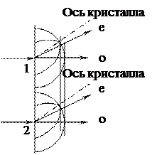 кристалле можно пояснить с помощью принципа Гюйгенса. На рис. 3, б построены волновые поверхности обыкновенного и необыкновенного лучей с центрами в точках 1 и 2 лежащих на поверхности кристалла при нормальном падении. Для обыкновенного луча они представляют собой концентрические окружности с центрами в соответствующих точках, а для необыкновенного – овалы, вытянутые вдоль оси кристалла. Направление лучей о и е соответствует осям, проведенным из точек 1 и 2 в направлении точек касания соответствующих волновых фронтов и их огибающих. Из рис. 3, б следует, что направление обыкновенного луча о совпадает с нормалью к соответствующей волновой поверхности. Необыкновенный же луч е заметно отклоняется от нормали к волновой поверхности в сторону акустической оси.