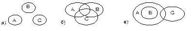Теория к задачам 5-7: Сравнимыми называются понятия, в содержаниях которых имеется хотя бы один общий признак /«круг», «квадрат» - общий признак: «геометрическая фигура»; «кошка», «собака» - общий признак: «животное»/. Несравнимыми называются понятия, не имеющие в содержаниях общих существенных признаков /«треугольник», «уголовный кодекс»/. Совместимыми называются понятия, в объемы которых входит хотя бы один общий элемент. /«студент», «спортсмен»; «круг», «маленький круг»; «собака», «пудель»/. Несовместимыми называются понятия, не имеющие в своих объемах общих элементов /«круг», «квадрат»; «собака», «кошка»/. При этом, нельзя путать отношения совместимости с отношениями целого и части /«компьютер» и «монитор» – понятия несовместимые. Отношения совместимости: равнозначность, перекрещивание (пересечение), подчинение. Равнозначность – объем одного понятия полностью совпадает с объемом другого понятия /«Улан-Удэ», «Столица Бурятии»/; перекрещивание (пересечение) – объемы понятий частично совпадают / «студент», «спортсмен»/; подчинение – объем одного полностью входит в объем другого, но не исчерпывает его /«спортсмен», «легкоатлет»/. При подчинении подчиняющее понятие называется родом по отношению к подчиненному, а подчиненное – видом по отношению к подчиняющему /понятие «спортсмен» является родовым по отношению к видовому «легкоатлет», а понятие «легкоатлет» будет видовым по отношению к понятию «спортсмен»/. Отношения несовместимости: соподчинение, противоположность и противоречие. Соподчинение – объемы двух понятий А и В произвольным образом входят в объем третьего родового понятия С, но не исчерпывают его /«круг», «квадрат», «геометрическая фигура»/. Противоположность – объемы понятий А и В занимают в объеме понятия С наиболее удаленные относительно некоего качества позиции /А-«белый», В-«черный»/. Противоречие – объемы понятий А и В полностью исчерпывают объем родового понятия С /А-«белый», В-«небелый»/. Отношение между понятиями иллюстрируются с помощью так называемых кругов Эйлера: