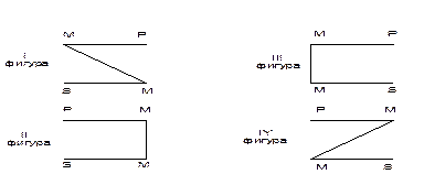 Об истинности данного вывода можно судить, проанализировав проиллюстрированные выше отношения между понятиями «Петров» - S, «адвокат» - M, «юрист» - P. Если объем понятия «Петров» входит в объем понятия «адвокат», а объем понятия «адвокат» - в объем понятия «юрист», то объем понятия «Петров» входит в объем понятия «юрист». Структура ПКС: В ПКС различают три термина: меньший, больший и средний. Меньший термин – S – субъект заключения. Больший термин – Р – предикат заключения. Средний термин – М – термин, входящий в посылки, и не входящий в заключение. Меньшая посылка – посылка, в которую входит меньший термин S. Большая посылка – посылка, в которую входит больший термин Р. В стандартной форме ПКС сначала записывают большую посылку, под ней меньшую. Проводят черту, под чертой – заключение. В примере 1 субъектом заключения является понятие «Петров», предикатом заключения является понятие «юрист», поэтому меньший термин S – это «Петров», больший термин Р – «юрист». Понятие «адвокат» входит в обе посылки и не входит в заключение, поэтому «адвокат» - средний термин М. Меньшая посылка – «Петров – адвокат», большая посылка – «Все адвокаты – юристы». Заключение – «Петров – юрист». Общие правила простого категорического силлогизма: Правила посылок: 1. Из двух отрицательных суждений нельзя сделать определенного вывода. 2. Если одна посылка отрицательная, то и заключение будет отрицательным. 3. Из двух частных суждений нельзя сделать определенного вывода. 4. Если одна посылка частная, то и заключение будет частным. Правила терминов: 1. В силлогизме должно быть только три термина. /Пример 6: «Все адвокаты – юристы, а Петров – звезда эстрады» - нет общего термина, поэтому нет никакой связи между этими суждениями и нельзя сделать никакого вывода/. /Пример 7: «Материя вечна. Шелк – материя. Следовательно, шелк вечен» - слово «материя» обозначает здесь два разных понятия, значит, вывода сделать нельзя/. 2. Средний термин должен быть распределен[2] хотя бы в одной из посылок. 3. Крайний термин (S, Р) распределен в заключении тогда и только тогда, когда он распределен в посылках. Пример 8: P+ М- «Все преступники должны нести ответственность за свои деяния». S+ М- «Петров должен нести ответственность за свои деяния». S+ Р- «Петров – преступник». В данном примере нарушено второе и третье правила терминов, так как средний термин М не распределен ни в одной из посылок, а больший термин Р не распределен в заключении, но распределен в посылке. Часто для того, чтобы убедиться в правильности ПКС бывает достаточно проверить частные правила – правила фигур. Правила фигур: В зависимости от расположения среднего термина выделяют четыре фигуры ПКС: