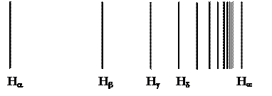 Изолированные атомы в виде разреженного газа или паров металла испускают спектр, состоящий из отдельных спектральных линий. В соответствии с этим спектр испускания атомов называется линейчатым. На рис. 1. показана часть спектра испускания атомов водорода в видимой и близкой ультрафиолетовой области. Аналогичный характер имеют и спектры других атомов. Линии в спектрах атомов объединяются в группы или, как их называют, серии линий. Символами Нa, Нb, Нg, Нd обозначены видимые линии, Нµ называется границей серии. Очевидно, что линии располагаются в определенном порядке. Бальмер установил, что длины волн показанной серии могут быть точно описаны формулой: