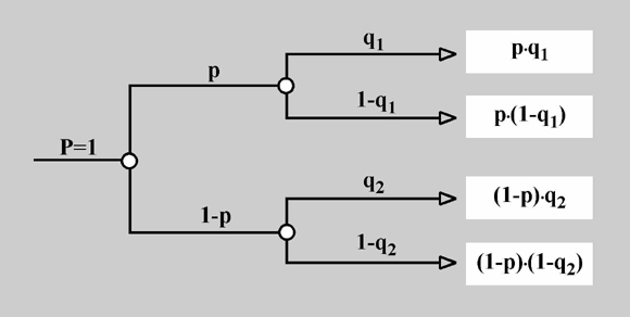 При оценки вероятности наступления какого-либо случайного события очень важно предварительно хорошо представлять, зависит ли вероятность наступления интересующего нас события от того, как развиваются остальные события. В случае классической схемы, когда все исходы равновероятны, мы уже можем оценить значения вероятности интересующего нас отдельного события самостоятельно. Мы можем сделать это даже в том случае, если событие является сложной совокупностью нескольких элементарных исходов. А если несколько случайных событий происходит одновременно или последовательно? Как это влияет на вероятность реализации интересующего нас события? Если я несколько раз кидаю игральную кость, и хочу, чтобы выпала "шестерка", а мне все время не везет, значит ли это, что надо увеличивать ставку, потому что, согласно теории вероятностей, мне вот-вот должно повезти? Увы, теория вероятности не утверждает ничего подобного. Ни кости, ни карты, ни монетки не умеют запоминать, что они продемонстрировали нам в прошлый раз. Им совершенно не важно, в первый раз или в десятый раз сегодня я испытываю свою судьбу. Каждый раз, когда я повторяю бросок, я знаю только одно: и на этот раз вероятность выпадения "шестерки" снова равна одной шестой. Конечно, это не значит, что нужная мне цифра не выпадет никогда. Это означает лишь то, что мой проигрыш после первого броска и после любого другого броска - независимые события. События А и В называются независимыми, если реализация одного из них никак не влияет на вероятность другого события. Например, вероятности поражения цели первым из двух орудий не зависят от того, поразило ли цель другое орудие, поэтому события "первое орудие поразило цель" и "второе орудие поразило цель" независимы. Если два события А и В независимы, и вероятность каждого из них известна, то вероятность одновременного наступления и события А, и события В (обозначается АВ) можно посчитать, воспользовавшись следующей теоремой. Теорема умножения вероятностей для независимых событий: P(AB) = P(A)*P(B) - вероятность одновременного наступления двух независимых событий равна произведению вероятностей этих событий. Пример. Вероятности попадания в цель при стрельбе первого и второго орудий соответственно равны: р1=0,7; р2=0,8. Найти вероятность попадания при одном залпе обоими орудиями одновременно. Решение: как мы уже видели события А (попадание первого орудия) и В (попадание второго орудия) независимы, т.е. Р(АВ)=Р(А)*Р(В)=р1*р2=0,56. Что произойдет, с нашими оценками, если исходные события не являются независимыми? Давайте немного изменим предыдущий пример. Пример. Два стрелка на соревнованиях стреляют по мишеням, причем, если один из них стреляет метко, то соперник начинает нервничать, и его результаты ухудшаются. Как превратить эту житейскую ситуацию в математическую задачу и наметить пути ее решения? Интуитивно понятно, что надо каким-то образом разделить два варианта развития событий, составить по сути дела два сценария, две разные задачи. В первом случае, если соперник промахнулся, сценарий будет благоприятный для нервного спортсмена и его меткость будет выше. Во втором случае, если соперник прилично реализовал свой шанс, вероятность поразить мишень для второго спортсмена снижается. Для разделения возможных сценариев (их часто называют гипотезами) развития собы