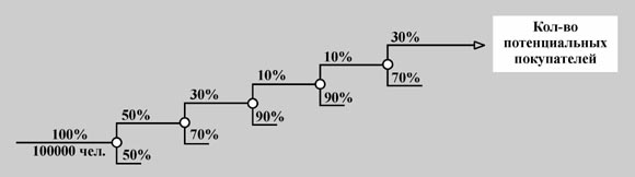 Эта схема очень удобна для анализа последовательных случайных событий. Остается выяснить еще один немаловажный вопрос: откуда берутся исходные значения вероятностей в реальных ситуациях? Ведь не с одними же монетами и игральными костями работает теория вероятностей? Обычно эти оценки берутся из статистики, а когда статистические сведения отсутствуют, мы проводим собственное исследование. И начинать его нам часто приходится не со сбора данных, а с вопроса, какие сведения нам вообще нужны. Пример. Допустим, нам надо оценить в городе с населением в сто тысяч жителей объем рынка для нового товара, который не является предметом первой необходимости, например, для бальзама по уходу за окрашенными волосами. Рассмотрим схему "дерева вероятностей". При этом значение вероятности на каждой "ветке" нам надо приблизительно оценить. Итак, наши оценки емкости рынка: 1) из всех жителей города женщин 50%, 2) из всех женщин только 30% красят волосы часто, 3) из них только 10% пользуются бальзамами для окрашенных волос, 4) из них только 10% могут набраться смелости попробовать новый товар, 5) из них 70% обычно покупает все не у нас, а у наших конкурентов.
