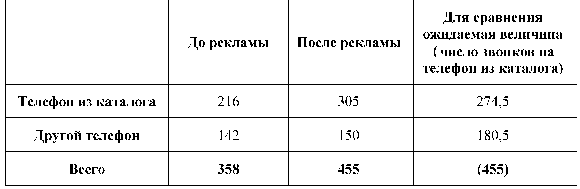 Последний столбец в таблице - ожидаемые величины. Это наши оценки, сделанные из предположения, что ничего не изменилось, и реклама не оказала никакого действия, т.е. произошло общее оживление на рынке и больше ничего, а пропорции между числом звонков на оба телефона должны сохраниться в точности.{Ожидаемая величина для телефона из каталога}=455ґ216/358=274,5{Ожидаемая величина для другого телефона}=455ґ142/358=180,5.Наше предположение, о том, что реклама не оказала никакого воздействие на изменение числа покупателей, носит название нулевой гипотезы. Альтернативная гипотеза заключается в предположении о наличии такого влияния.Наша задача - выбрать более достоверную из двух этих гипотез.Чтобы оценить, насколько значимы отклонения реальной ситуации от ожидания по нулевой гипотезе, для обоих телефонов мы должны посчитать величину: X 2= поставить их в таблицу и просуммировать.