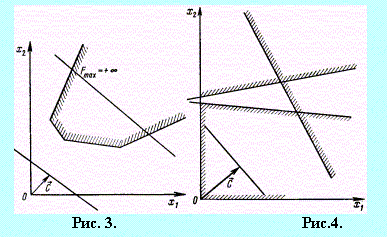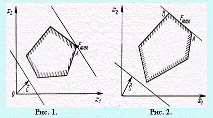 Каждое из неравенств (20), (21) системы ограничений задачи геометрически определяет полуплоскость соответственно с граничными прямыми Таким образом, исходная задача линейного программирования состоит в нахождении такой точки многоугольника решений, в которой целевая функция F принимает максимальное значение. Эта точка существует тогда, когда многоугольник решений не пуст и на нем целевая функция ограничена сверху. При указанных условиях в одной из вершин многоугольника решений целевая функция принимает максимальное значение. Для определения данной вершины построим линию уровня Заканчивая рассмотрение геометрической интерпретации задачи (19) – (21), отметим, что при нахождении ее решения могут встретиться случаи, изображенные на рис. 1 - 4. Рис. 1 характеризует такой случай, когда целевая функция принимает максимальное значение в единственной точке А. Из рис. 2 видно, что максимальное значение целевая функция принимает в любой точке отрезка АВ. На рис. 3 изображен случай, когда целевая функция не ограничена сверху на множестве допустимых решений, а на рис. 4 – случай, когда система ограничений задачи несовместна.