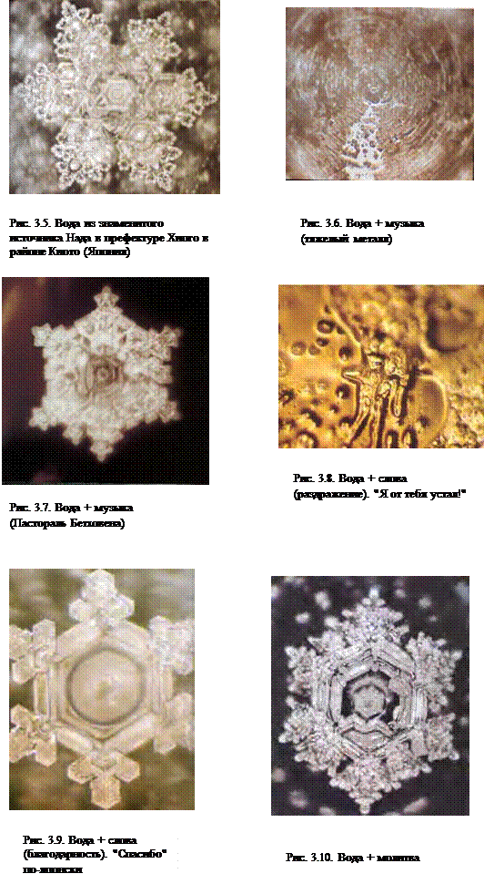 Состояние физического организма, структура воды и других входящих в него элементов определяется взаимоотношением влияния внешних воздействий и собственного сознания, защищённости его самого от вредных влияний внешних воздействий. Хорошо организованное сознание, находящееся в дружбе со смыслом, а значит, и со скрытым порядком тонкого мира, гарантирует надёжную защиту от негативных влияний, сглаза, порчи, нейро-лингвистического программирования, зомбирования и прочих влияний. Необходимо стремиться видеть каждого человека не как конструкцию из вещества с его красками и формами, а как букет свойств, состоящий из изумительных цветов в виде Истины, Любви, Добра, Мужества, Мудрости и т. п., а также сорняков в виде их антиподов: лжи, зла, ненависти, глупости, трусости и т. д. И никто не заставляет нас потреблять эти сорняки, если даже они пышно разрослись и заглушили собой цветы жизни. Как уже было сказано, любить человека — значит стараться увидеть в нём его высшее Я, т. е. эти цветы и всячески способствовать освобождению его сознания от сорняков. При этом сам автоматически оказываешься под защитой. Таковы законы построенного на Любви Божественного порядка. Упомянутое выше открытие белорусских физиков проливает ещё один луч света на механизмы Космогенеза и Антропогенеза. Очень важна, даже первостепенна по своему положительному влиянию на организм другая сторона нашей сущности, первейшая по своему значению для всего, что имеет место быть. Это способность видеть в других и восхищаться проявлением красоты в виде мудрости, честности, мужества, стремления к Истине, Добру, Любви. Иногда это проявляется в виде отчётливого журчания в груди, когда встречаешься с подобным явлением, с людьми, проявляющими честность и мужество, правдивость и доброту, самостоятельность и ответственность и другие дары мира горнего. Очень точно об этом сказал известный художник и мужественный исследователь-путешественник Рокуэлл Кент: "Любить Бога — значит отдавать должное Его Дарам в других, и особенно любить талантливых людей и гениев, в которых этих Даров много. Тот, кто их не любит и клевещет на них — клевещет на Бога". Всё это: и обсуждаемое открытие, и приводимые мысли, и эпизоды повседневности подтверждают рассматриваемые в книге процессы эволюции как одухотворения материи и материализации Духа, т. е. его проникновения в материю с целью её преобразования и упорядочивания. Здесь так же, как и во всём имеет место дуализм, т. е. взаимосвязанное проявление двойственности. С одной стороны, как уже было сказано, действенное проявление Духа зависит от степени упорядоченности материи, её структурированности, с другой стороны, одухотворение способствует, как видно из рис. 3.5 ¸ 3.10 структурированию вещества и повышению его способности взаимодействовать с Духом. Дух как бы активно готовит себе партнёров, сотрудников, помощников среди материальных объектов. А задача человека с его свободой воли, постоянно стоящего перед проблемой выбора, непрерывно учиться различению Божественного и его противоположности для сокращения ошибок при решении этой непростой задачи выбора. При этом, как видно из рис. 3.5 ¸ 3.10, мы сами в значительной мере определяем порядок внутри собственного организма и, следовательно, его здоровье, в зависимости от того, что нас притягивает, чему мы с