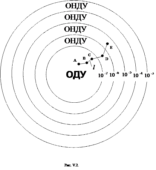 Субъективная спонтанная проявленная деятельность, базирующаяся на интуиции подсознания, является оптимальной, но только в пределах предшествующего опыта. Наконец, истинная спонтанная, определяемая интуицией сверхсознания, обеспечивает безошибочное управление в штатных, нештатных и аварийных ситуациях. Мы её рассмотрим подробнее несколько ниже. А пока я советую читателям серьёзно проработать этот труд [8], так как он даёт основательную пищу для размышлений о мире, в котором мы живём, и как не адекватно ему мы строим порой свою деятельность. Авторы справедливо объясняют низкую эффективность профилактических мероприятий, носящих командно-декларативный характер и указывают на необходимость воздействия на те уровни психических структур, которые являются истинно причинными и профилактика которых способна предотвратить переход с оптимальных на десинхронизированные виды деятельности. И они предлагают включить в качестве профилактических мероприятий усвоение лётными составами механизмов возникновения потенциально опасных типов поведения из-за сознательных нарушений лётной дисциплины. В какой-то мере знание возможных последствий нарушения может оказать реальное воздействие. Но причины сознательных нарушений в книге [8] фактически не рассмотрены. А они, конечно, имеются и кроются тоже в психологии человека в виде до поры, до времени неощущаемой потенциально опасной бомбы. Попробуем извлечь её, используя уже упомянутый интуитивно-логичный научный метод, строго опирающийся на реальные факты. Психика человека, находящаяся в плену телесного сознания, делает его порой заложником игры вероятностей очень малых чисел. Каждый человек строит свою деятельность в пределах некоторой многомерной "области допустимых управлений" (ОДУ), которой соответствует требкемый уровень безопасности, определяемый как некоторая приемлемая, хотя и зачастую неосознаваемая вероятность неблагоприятного исхода (10 - n) на некоторое количество реализаций или времени. Выход из ОДУ, а такое случается из-за ошибок или соответствующего состояния, сопровождается увеличением вероятности беды с 10 - n до 10 - (n-1) к примеру, как это показано на рис. V.2. Но всё же вероятность остаётся очень малой, и при небольшом количестве реализаций или времени наказание за нарушение границы ОДУ, как правило, не следует, т. к. происшествие зависит не только от управления, но и стечения обстоятельств. Другими словами закон обратной связи в цепи "нарушение-наказание", как правило, до определённого момента не срабатывает и в психике человека укрепляется новая ОДУ, соответствующая сниженной безопасности жизнедеятельности 10 - (n-1). Тем же, у кого малая вероятность сработала, учиться часто оказывается слишком поздно по известным причинам. Всё это один к одному относится к лётным экипажам, в частности, гражданской авиации, только принцип "авось пронесёт" касается не только их интересов, поэтому профилактика выхода за пределы ОДУ, определяемой нормативно-требуемым процессом, должна быть жёсткой и тщательной, опирающейся на всё, что знает наука о человеке и даже более того, где не может наука, должно выручать искусство. Исследование характера взаимодействия ментального, астрального и физического тел человека установили, что прямых каналов воздействия ментальное тело на физическое не