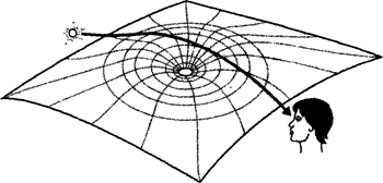 В 1919 году две команды ученых подтвердили предсказание Эйнштейна, что свет далекой звезды будет искривляться, проходя вблизи Солнца. Таким образом, будет казаться, что звезда несколько изменила свое положение в пространстве, притягиваемая Солнцем. Это происходит потому, что Солнце искривляет пространство-время, окружающее его. Таким образом, гравитация не «притягивает». Это пространство «толкает».