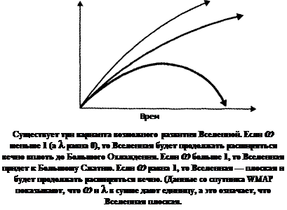 Ученые считают, что если величина ω меньше единицы, то во Вселенной недостаточно материи, чтобы обратить вспять перво- начальное расширение, вызванное Большим Взрывом. (Подобно примеру с подброшенным камнем: если масса Земли недостаточно велика, то камень преодолеет земную гравитацию и улетит прочь.) В результате Вселенная будетрасширяться вечно, погружаясь вледеня- щий холод — температуры ее приблизятся к абсолютному нулю. (Это принцип работы холодильника или кондиционера^. Расширяясь, газ охлаждается. Например, газ, циркулирующий в трубке вашего конди- ционера, расширяется, охлаждая трубку и вашу комнату.)