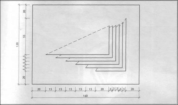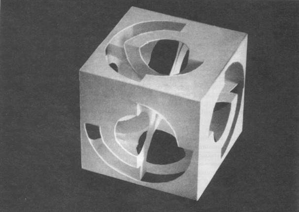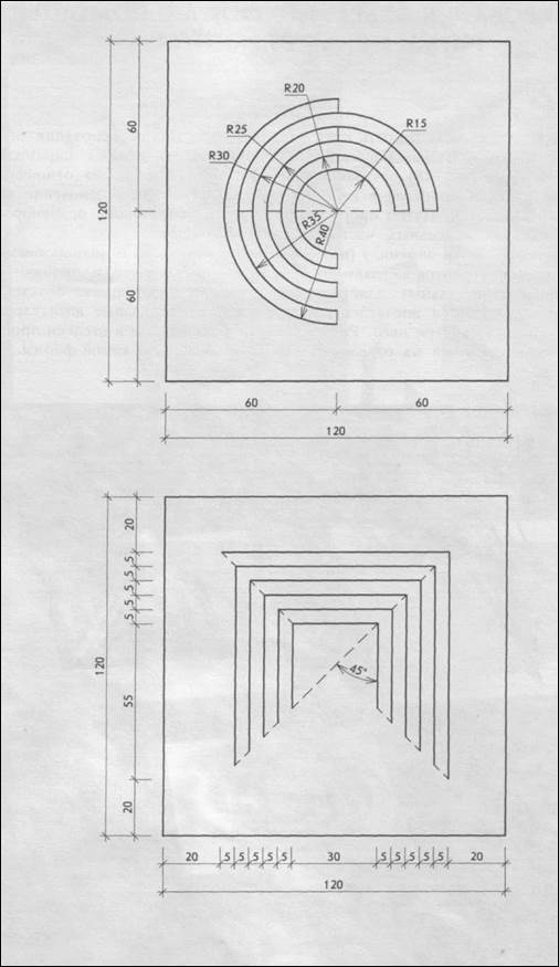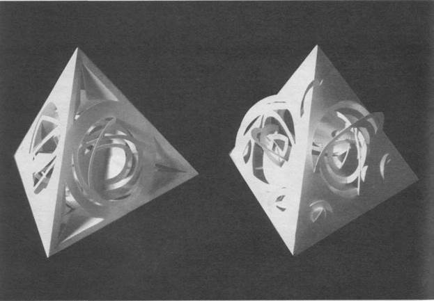 Рассмотрим еще одну возможность получить объемную форму из листа бумаги без клея. На чертеже (ил. 28) показаны геометрическиерисунки прорезей в виде окружностейи квадратов. Путем прорезывания и отгибания отдельных частей можно создатьполусферу и пирамиду (ил.27). Формапирамиды строится из взаимно перпендикулярных треугольных пластин разной величины. Создается впечатление объема и пространства внутри него. Ритмическийрисунок прорезей на горизонтальной поверхности основания определяет ориентацию объема пирамиды во внешнем пространстве по отношению к зрителю. Организуется движение вокруг пирамиды и направление основного движения внутрь нее. Этот прием можно использовать для членения поверхностей и проникновения во внутреннее пространство объема. При этом достигаются разные впечатления от решения поверхности и степени пространственного раскрытия самой формы.