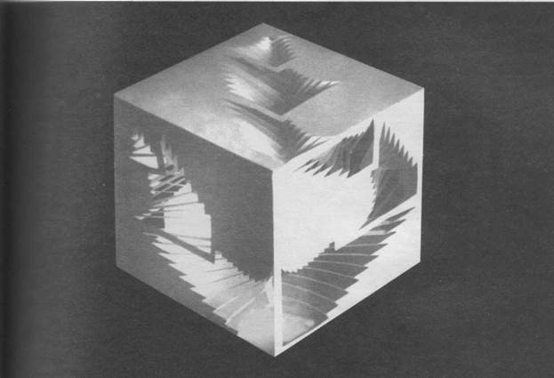 ИЛЛЮСТРАЦИЯ 29 ЗАДАНИЕ 8. Членение объемной формы с помощью ритмических элементов. ЦЕЛЬ: Изучить свойства объемных форм: геометрический вид, величина, масса, положение в пространстве. ЗАДАЧИ: Проследить, как меняются свойства геометрической формы в зависимости от степени ее членения и характера используемых для членения элементов. ТРЕБОВАНИЯ: Выполнить макеты объемных форм из ритмических элементов по предложенным образцам (ил. 27—29). Разработать одну из объемных форм (куб, пирамида, тетраэдр) с помощью ритмических пространственных элементов (ил. 30—33). МЕТОДИЧЕСКИЕ УКАЗАНИЯ: Элементы, как части плоскости, могут изменяться по ритмическим закономерностям и отгибаться наружу или внутрь основного объема. Отгибать элементы надо только после склеивания основного объема, чтобы не помять отгибаемые детали. Открывается интересная возможность исследования пространственных сочетаний разных геометрических форм: куба, пирамиды, полусферы, тетраэдра. В зависимости от количества, размеров, расположения членящих элементов получается различная степень изменения первоначальной массы основного объема. Из глухой, статической, форма может превратиться в легкую, ажурную, имеющую свое внутреннее пространство. Когда объемная форма гладкая, поверхность ее не разработана, то внутреннее пространство не читается. Если поверхности членятся, прорезаются, то появляются пространственные проемы, начинает выявляться внутреннее пространство самой объемной формы. Один из педагогов БАУХАУЗа, Моголь-Надь, рассматривал пространство как результат развития массивности формы. Вот некоторые этапы преобразования, которые, по его мнению, происходят с простой формой по пути превращения цельного массива в пространственную форму: -предельная массивность, целостность нерасчлененного объема; -цельная форма, но уже пластически преобразованная; -форма, сохраняющая композиционную целостность построения с активным включением пространства. На этих заданиях изучаются первичные свойства объемных форм: величина, пропорции; геометрический вид; положение в пространстве; масса как состояние, изменяющееся в пределах от наибольшей массивности до максимальной пространственности; светотень. Используются такие композиционные средства, как нюанс, контраст, пластический ритм.