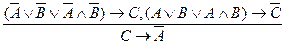 Пусть Пример. Если Утверждение. Если Пусть 1) 2) существуют Теорема (о полноте метода резолюций). Множество дизъюнктов S противоречиво в том и только в том случае, когда существует резолютивный вывод из S, заканчивающийся 0. Существует эффективный метод логического вывода – метод резолюции. Он основан на том, что выводимость формулы В из множества посылок F 1, F 2, F 3, …, Fn равносильна доказательству теоремы ├─ (F1 Ù F2 Ù F3 Ù... Ù Fn ® B), формулу которой можно преобразовать так: ├─ (F1 Ù F2 Ù F3 Ù... Ù Fn ® B) ├─ ( ├─ Следовательно, заключение В истинно тогда и только тогда, когда формула F1 Ù F2 Ù F3 Ù... Ù Fn Ù Для анализа этой формулы все подформулы Fi и F1 Ù F2 Ù F3 Ù... Ù Fn Ù Опишем пошагово алгоритм вывод по методу резолюций. Шаг 1. Придать отрицание заключению, т. е. Шаг 2. Привести все формулы посылок и отрицания заключения к конъюнктивной нормальной форме. Шаг 3. Выписать множество дизъюнктов всех посылок и отрицания заключения S = { D 1, D 2, …, Dk }. Шаг 4. Выполнить анализ пар множества S по правилу: «если существуют дизъюнкты Di и Dj, один из которых (Di) содержит переменную А, а другой (Dj) – контрарную переменную Шаг 5. Если в результате соединения дизъюнктов, содержащих контрарные литеры, будет получена пустая резольвента – 0, то конец, в противном случае включить резольвенту в множество дизъюнктов S и перейти к шагу 4. Примеры. 1. Работа автоматического устройства, имеющего три клапана А, В и С, удовлетворяет следующим условиям: если не срабатывают клапаны А или В или оба вместе, то срабатывает клапан С; если срабатывают клапаны А или В или оба вместе, то не срабатывает клапан С. Следовательно, если срабатывает клапан С, то не срабатывает клапан А.