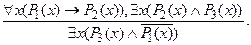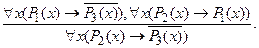 Пример. Рассуждение «Ни один торговец наркотиками не является наркоманом. Некоторые наркоманы привлекались к ответственности. Следовательно, некоторые люди, привлекавшиеся к ответственности, не являются торговцами наркотиков». В этом рассуждении три одноместных предиката P 1(x)=«быть торговцем наркотиков», P 2(x)=«быть наркоманом», P 3(x)=«привлекаться к ответственности». Формула сложного рассуждения должна быть записана так: