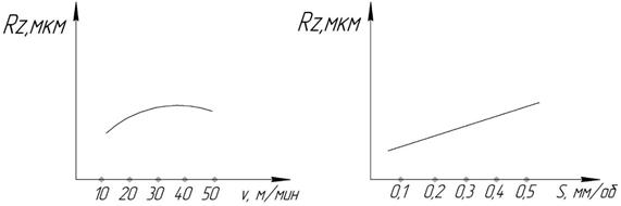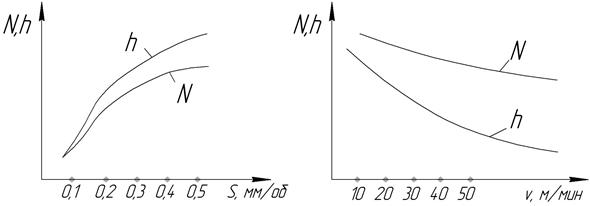 При увеличении подачи высота неровностей возрастает. При малых подачах основное влияние оказывают не геометрические факторы, а пластическая и упругая деформации, скорость резания и радиус при вершине резца. При больших значениях подачи на шероховатость оказывают влияние геометрические факторы (следы движения инструмента). Глубина резания почти не влияет на шероховатость обработанной поверхности. Из геометрических параметров инструмента наибольшее влияние на шероховатость поверхности, как следует из формул, оказывает угол в плане Задний угол