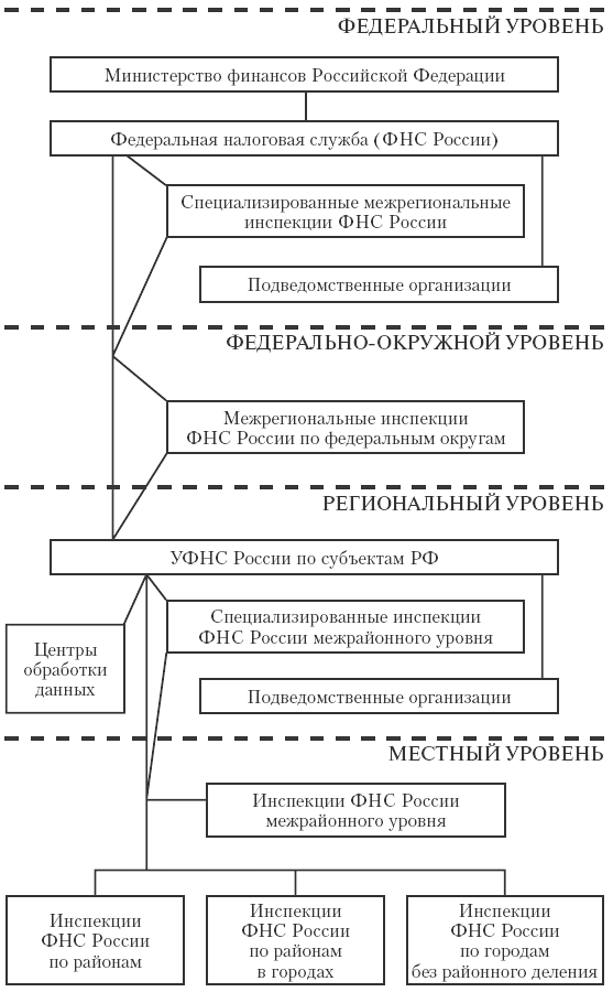 Налоговые органы РФ являются постоянно действующим контрольно-проверочным государственным органом исполнительной власти, созданным и наделенным определенными полномочиями для решения государственных задач в сфере налогообложения. Налоговые органы РФ – это единая система государственных учреждений, однородных по своим задачам, связанных между собой вертикальной системой власти-подчинения, организационно объединенных в единое целое, осуществляющих деятельность контрольного характера относительно соблюдения всей совокупности законодательства о налогах и сборах и иных налоговых норм, а в предусмотренных законом случаях являющихся и агентами валютного контроля. Налоговые органы РФ – единая централизованная система контроля за соблюдением законодательства о налогах и сборах, правильностью исчисления, полнотой и своевременностью внесения в бюджетную систему РФ налогов и сборов. В случаях, предусмотренных законодательством РФ, налоговые органы в пределах своей компетенции также осуществляют контроль: – за правильностью исчисления, полнотой и своевременностью внесения в бюджетную систему РФ других обязательных платежей, установленных законодательством РФ; – за производством и оборотом этилового спирта, спиртосодержащей, алкогольной и табачной продукции; – за соблюдением валютного законодательства РФ. Правовая основа деятельности налоговых органов РФ. В настоящее время правовое регулирование деятельности налоговых органов Российской Федерации непосредственно осуществляется: – статьями гл. 5 НК; – статьями Закона о налоговых органах – специализированного нормативно-правового акта, определяющего правовой статус, порядок организации и деятельности системы налоговых органов РФ. Закон о налоговых органах является институциональным законодательным актом, определяющим правовой статус системы государственных налоговых органов РФ. Помимо НК и Закона о налоговых органах на территории РФ действует еще ряд нормативно-правовых актов разной юридической силы, которые тем или иным образом связаны с налоговыми органами. Организационная система налоговых органов. В организационном плане система налоговых органов представлена уполномоченным по контролю и надзору в области налогов и сборов федеральным органом исполнительной власти и его территориальными органами. За последние 15 лет название уполномоченного федерального органа исполнительной власти, возглавляющего систему налоговых органов, неоднократно изменялось. На разных этапах эту роль выполняли: – Государственная налоговая служба Российской Федерации (ГНС России) (с 1991 по 1998 г.); – Министерство Российской Федерации по налогам и сборам (МНС России) (с 1999 по 2004 г.); – Федеральная налоговая служба (ФНС России) (осень 2004 г. – по настоящее время). Федеральная налоговая служба находится в ведении Минфина России (рис. 1). В структуре налоговых органов можно выделить четыре уровня (федеральный, федерально-окружной, региональный и местный), соответствующих уровням государственного управления и административно-территориальному делению Российской Федерации. Вышестоящим налоговым органам дается право отменять решения нижестоящих налоговых органов в случае их несоответствия Конституции, федеральным законам и иным нормативным правовым актам. Правовой стат