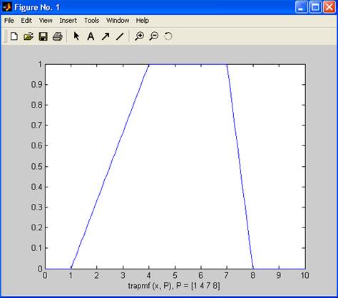 Трапецієвидна ФП: y = trapmf(x, [a b c d]), де вектор x - базове безліч, на якому визначається ФП. Величини a і d задають нижню підставу трапеції, b і c - верхнє підставу.