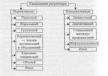 Способы социального регулирования поведения людей можно по характеру свести в три основные группы: побуждения, понуждения, принуждения. Побуждение — метод социального регулирования, обращенный к психологической сфере (чувствам, привычкам, эмоциям) человека, убеждающий в полезности, выгодности определенного поведения, распределении тех или иных социальных ролей. Акцент делается на авторитете, а не на насилии. Понуждение — метод регулирования, основанный главным образом на материальном стимулировании (поощрении, вознаграждении или лишении соответствующих имущественных благ, привилегий), когда та или иная выгода определяет желаемое поведение. Наконец, принуждение — это способ воздействия, когда социально необходимое или желаемое поведение достигается с применением насилия, т.е. лицам, отклоняющимся от установленных правил поведения, причиняются физические или психические страдания. Такой метод регулирования основывается на возможности (угрозе) государственного или общественного принуждения, а в случае необходимости и реализации этой угрозы. В социальном регулировании, как правило, задействованы все эти методы в различных комбинациях, или может использоваться каждый метод в отдельности. Они позволяют достаточно гибко регулировать поведение индивидов и социальных групп в обществе. Важное место в социальном регулировании занимают структуры и способы контроля за результатами воздействия на общественные отношения и процессы. В качестве контролирующих инстанций могут выступать высшие государственные органы законодательной или исполнительной власти, общественные организации, средства массовой информации, специализированные контрольные организации (например, налоговая инспекция, аудиторские организации, институт уполномоченного по правам человека и т.д.). Социальное регулирование может осуществляться в правовых (отдельные законы, кодексы), моральных (кодексы чести, этика предпринимательства), эстетических (мода, стиль), орг?низационно-технических(пра-вила безопасности, стандарты), централизованных (директивы, программы) формах. Таким образом, в обществе существует множество регулятивных систем и методов воздействия, которые учитывают всю многогранность и сложность социального бытия. Рассмотрим систему социальных регуляторов и место права в этой системе. В ней прежде всего можно выделить нормативные и ненормативные регуляторы. К нормативным регуляторам относятся правовой, моральный, религиозный, юридико-технический и нормативно-технический, групповой (корпоративный) регуляторы и деловой обычай (деловое обыкновение). Разновидностью правового регулятора являются правовой обычай («обычное право»), прецедент, доктрина (в некоторых странах). Совокупность нормативных регуляторов образует социальную нормативно-регулятивную систему, оказывающую воздействие на поведение индивидов в обществе. К ненормативной регулятивной системе относится ценностный, директивный и информационный регуляторы, а также такой своеобразный регулятор, как социальный институт предсказаний. Ценностный регулятор определяет поведение членов общества с помощью исторически сложившейся системы социальных ценностей, социально-психологических установок, стереотипов, штампов. Он проявляется как в культуре различных этно-национ