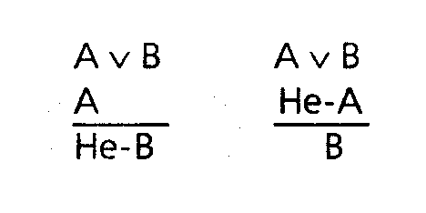 Разделительно-категорический силлогизм есть умозаключение, в котором одна посылка является разделительным суждением, а вторая посылка и вывод - простыми категорическими суждениями. Например, просыпаетесь вы утром и, еще лежа в постели, начинаете рассуждать: “Сегодня днем я могу пойти на свидание или на занятия. Пойду-ка я на свидание. Следовательно, на занятия я не пойду”. Здесь первая посылка вашего рассуждения представляет собой разделительное суждение “Я могу пойти на свидание (А) или пойти на занятия (В)”, символически: A v В. Вторая посылка утверждает одну из возможностей, указанных в разделительной посылке: “Я пойду на свидание” (А). Вывод отрицает вторую возможность: “Следовательно, я не пойду на занятия” (Не-В). Ясно, что вы можете рассуждать и несколько иначе: “Нет, на свидание я не пойду. Следовательно, я пойду на занятия”. Символически эти два способа рассуждения можно представить следующим образом: