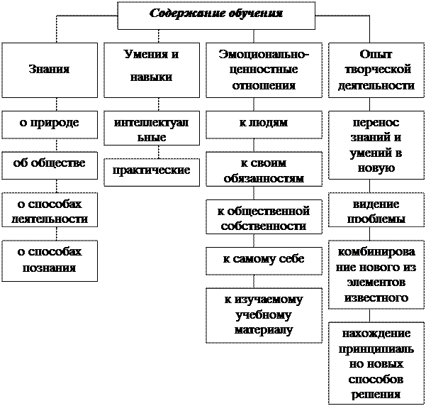 В процессе обучения ученики должны усвоить содержание образования, которое включает в себя ряд компонентов. Содержание образования может быть усвоено на уровне общего образования, на уровне политехнического и на уровне профессионального образования. При этом все уровни взаимосвязаны, так как общие элементы системы знаний умений и навыков: научные факты, понятия, законы, теори, методы научных исследований.
