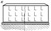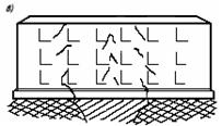 Зоны деструкции, ориентация трещин зависят от расположения ослаблений под фундаментом или наличием уплотнений грунта. Существенное влияние на схему образования трещин от неравномерной осадки основания оказывает конструктивное выполнение узлов и сопряжений, обеспечивающих пространственную жесткость здания. При неравномерных деформациях основания трещины появляются в несущих стеновых панелях (рис.5.1), на стыках, часто переходят на перегородки и панели перекрытий. Для анализа возможных вариантов трещинообразования несущий стеновой блок может быть рассмотрен с известной долей приближения как балка-стенка с различными условиями опирания. Ослабления основания у краев фундамента или же прочная опора под средней частью здания (рис. 5.1 а) вызывают напряженное состояние с максимальными растягивающими напряжениями в верхней трети балки-стенки над краем ослабленного участка основания. Наклонные трещины отрыва возникают от действия изгибающего момента и поперечной силы. Эти трещины могут не доходить до верхней кромки стены, т. к. критические растягивающие напряжения определяются, главным образом, поперечной силой. При значительных различиях податливости грунта (рис. 5.1 б) возникает вертикальная трещина сдвига на границе ослабленного и нормального основания. В этом случае наибольшее относительное смешение краев трещины отмечается в уровне фундамента. Если ослабленная зона грунта расположена под средней частью фундамента (рис. 5.1 в), трещины отрыва, вызванные неравномерной осадкой, наклонены к центру стены и к зоне ослабленного основания. Образование вертикальных трещин сдвига в этом случае маловероятно. При перегрузке простенка возникают вертикальные, горизонтальные и наклонные трещины. При неправильном опирании перекрытия появляются трещины смятия в верхней части панели. Сквозная силовая трещина любой ориентации может привести к снижению несущей способности и устойчивости стены. Наибольшую опасность представляют горизонтальные и наклонные трещины. Появление вертикальных силовых трещин в плоскости стены от перегрузок маловероятно, так как столб несущей стены работает в условиях плоской деформации, поэтому при центрально приложенной нагрузке следует ожидать возникновения трещин расслоения по толщине панели. Выпучивание несущей железобетонной стены, которое сопровождается появлением горизонтальных трещин, может быть следствием недопустимо большого эксцентриситета вертикальной нагрузки при неправильном монтаже; перегрузке стены в результате перераспределения усилий; неодинаковой деформативности различных по толщине слоев панели при неправильной технологии изготовления; горизонтальных перемещениях конструкций от неравномерной осадки. В ходе инструментальных измерений при обследовании стен с горизонтальными трещинами обязательно следует определять перемещения изгиба стены относительно краев панели, характеризующие степень выпучивания и реальный эксцентриситет вертикальной нагрузки. Различия в деформативности и загруженности вертикальных элементов здания вызывают неравномерность осадки несущих стен. Относительные смещения рядом расположенных вертикальных конструкций увеличиваются по высоте здания. Это может явиться причиной появления вертикальных трещин в узлах сопряжения панелей 