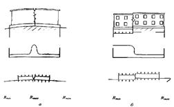 Рис. 7.1. Деформации зданий, вызванные неравномерной осадкой оснований а - прогиб; б – выгиб Причиной деформаций зданий могут быть повреждения инженерных коммуникаций, из которых агрессивные воды попадают в грунты. Плохое качество гидроизоляции также вызывает коррозию стен фундаментов.