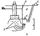 Рис. 7.3. Суффозионнос разрушение фунта под существующими фундаментами при открытом водоотливе: а - без ограждающего шпунта; б - при шпунте, не забитом до водоупора или недостаточно заглубленном ниже дна котлована; 1 - существующий фундамент; 2 - котлован возводимого здания; 3 - области возможного образования пустот; 4 - грифоны; 5 - насос; 6 - шпунт; h - глубина погружения шпунта ниже отметки дна котлована