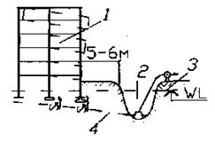 Рис. 7.4. Деформация здания вследствие понижения уровня подземных вод иглофильтровой установкой 1 – здание; 2 – шпунт; 3 – иглофильтр; 4 – уровень подземных вод до водопонижения; 5 – то же, после водопонижения