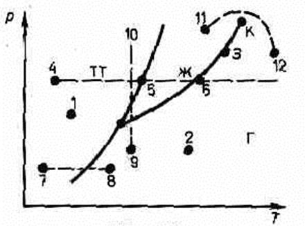 основе экспериментальных данных, позволяет судить, в каком состоянии находится данное вещество при определенных р и Т, а также какие фазовые переходы будут происходить при том или ином процессе. Например, при условиях, соответствующих точке 1 (рис. 116), вещество находится в твердом состоянии, точке 2 — в газообразном, а точке 3 — одновременно в жидком и газообразном состояниях. Допустим, что вещество в твердом состоянии, соответствующем точке 4, подвергается изобарному нагреванию, изображенному на диаграмме состояния горизонтальной штриховой прямой 4— 5— 6. Из рисунка видно, что при температуре, соответствующей точке 5, вещество плавится, при более высокой температуре, соответствующей точке 6,— начинает превращаться в газ. Если же вещество находится в твердом состоянии, соответствующем точке 7, то при изобарном нагревании (штриховая прямая 7— 8) кристалл превращается в газ минуя жидкую фазу. Если вещество находится в состоянии, соответствующем точке 9, то при изотермическом сжатии (штриховая прямая 9—10) оно пройдет следующие три состояния: газ — жидкость — кристаллическое состояние. На диаграмме состояний (см. рис. 115 и 116) видно, что кривая испарения заканчивается в критической точке К. Поэтому возможен непрерывный переход вещества из жидкого состояния в газообразное и обратно в обход критической точки, без пересечения кривой испарения (переход 11 — 12 на рис. 116), т. е. такой переход, который не сопровождается фазовыми превращениями. Это возможно благодаря тому, что различие между газом и жидкостью является чисто количественным (оба эти состояния, например, являются изотропными). Переход же кристаллического состояния (характеризуется анизотропией) в жидкое или газообразное может быть только скачкообразным (в результате фазового перехода), поэтому кривые плавления и сублимации не могут обрываться, как это имеет место для кривой испарения в критической точке.