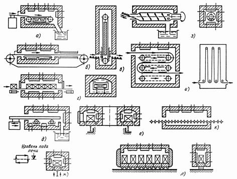 Рис. 2.2. Типи резистивних печей неперервної дії: а – конвеєрна з внутрішнім конвеєром; б – конвеєрна з зовнішнім конвеєром; в – з вертикальним конвеєром; г – штовхальна;