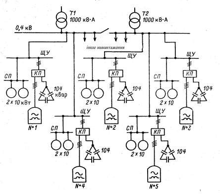 На рис. 5.16,а наведена схема електропостачання тигельних печей від цехової мережі 0,4 кВ з використанням індивідуальних автотрансформаторів. Зважаючи на „спокійний” характер навантаження таких печей, паралельно з ними живиться й інше навантаження. На рис. 5.16,б зображена схема електропостачання однієї печі зі встановленою апаратурою для контролю параметрів режиму, а також з апаратурою регулювання та контролю стану конденсаторів реактивної потужності. У трифазних мережах тигельні печі, як однофазне навантаження можуть створювати недопустимий рівень несиметрії (викликати перевищення допустимих значень напруги і струму зворотної послідовності). На рис. 5.16,в наведена схема електропостачання тигельної печі з пристроєм симетрування режиму за схемою Штейметца (СС, L), а також показані блоки автоматичного регулювання системи симетрування – АРИС, регулювання режиму печі – АРИР та перемикання РПН трансформатора. Індукційні установки підвищеної частоти живляться від перетворювачів трифазного струму промислової частоти у однофазний струм підвищеної частоти. До таких установок відносяться електромашинні перетворювачі, статичні помножувачі та перетворювачі частоти. На рис. 5.17 наведена схема статичного тиристорного перетворювача, який побудований за схемою „випрямляч – автономний інвертор”. Схема розділена на блоки: шафа живлення з комутаційною апаратурою, блок згладжу вальних реакторів, які згладжують випрямлений струм, інвертор, що перетворює постійний струм у змінний для живлення індуктора. Це перетворювач з явно вираженою ланкою постійного струму. Недоліком такого генератора є генерування у мережу струмів вищих гармонік. Ця обставина зумовлює необхідність їх підключення до мереж з низьким внутрішнім опором, або застосування фільтро-компенсувальних пристроїв.