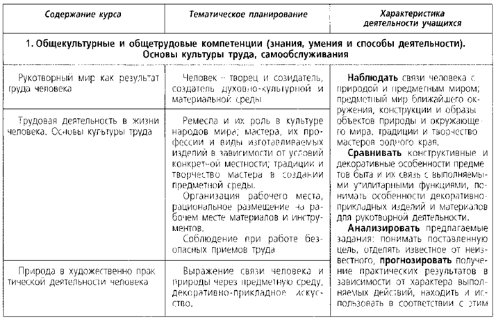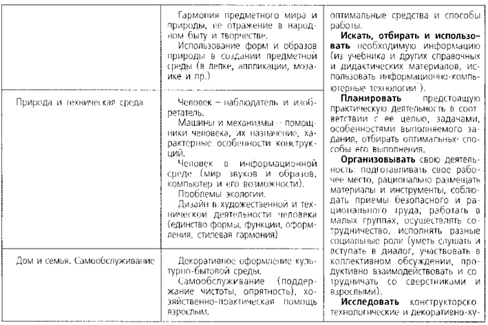 Информация, её отбор, анализ и систематизация. Способы получения, хранения, переработки информации. Назначение основных устройств компьютера для ввода, вывода, обработки информации. Включение и выключение компьютера и подключаемых к нему устройств. Клавиатура, общее представление о правилах клавиатурного письма, пользование мышью, использование простейших средств текстового редактора. Простейшие приёмы поиска информации: по ключевым словам, каталогам. Соблюдение безопасных приёмов труда при работе на компьютере; бережное отношение к техническим устройствам. Работа с ЦОР (цифровыми образовательными ресурсами), готовыми материалами на электронных носителях (СО). Работа с простыми информационными объектами (текст, таблица, схема, рисунок): преобразование, создание, сохранение, удаление. Создание небольшого текста по интересной детям тематике. Вывод текста на принтер. Использование рисунков из ресурса компьютера, программ Word и Power Point. Виды учебной деятельности учащихся: · простейшие наблюдения и исследования свойств материалов, способов их обработки, конструкций, их свойств, принципов и приёмов их создания; · моделирование, конструирование из разных материалов (по образцу, модели, условиям использования и области функционирования предмета, техническим условиям1); · решение доступных конструкторско-технологических задач (определение области поиска, нахождение необходимой информации, определение спектра возможных решений, выбор оптимального решения), творческих художественных задач (общий дизайн, оформление); · простейшее проектирование (принятие идеи, поиск и отбор необходимой информации, окончательный образ объекта, определение особенностей конструкции и технологии изготовления изделия, подбор инструментов, материалов, выбор способов их обработки, реализация замысла с корректировкой конструкции и технологии, проверка изделия в действии, представление (защита) процесса и результата работы). К концу обучения в начальной школе будет обеспечена готовность обучающихся к дальнейшему образованию, достигнут необходимый уровень первоначальных трудовых умений, начальной технологической подготовки, которые включают: · элементарные знания о значении и месте трудовой деятельности в создании общечеловеческой культуры, о простых и доступных правилах создания функционального, комфортного и эстетически выразительного жизненного пространства (удобство, эстетическая выразительность, прочность; гармония предметов и окружающей среды); · соответствующую возрасту технологическую компетентность: знание используемых видов материалов, их свойств, способов обработки; анализ устройства и назначения изделия; умения определять необходимые действия и технологические операции и применять их для решения практических задач; подбор материалов и инструментов в соответствии с выдвинутым планом и прогнозом возможных результатов; экономную разметку; обработку с целью получения деталей, сборку, отделку изделия; проверку изделия в действии; · достаточный уровень графической грамотности: выполнение измерений, чтение доступных графических изображений, использование чертёжных инструментов (линейка, угольник, циркуль) и приспособлений для разметки деталей изделий; опору на рисунки, план, схемы, простейшие чертежи при решении зада