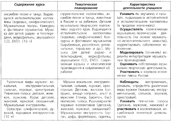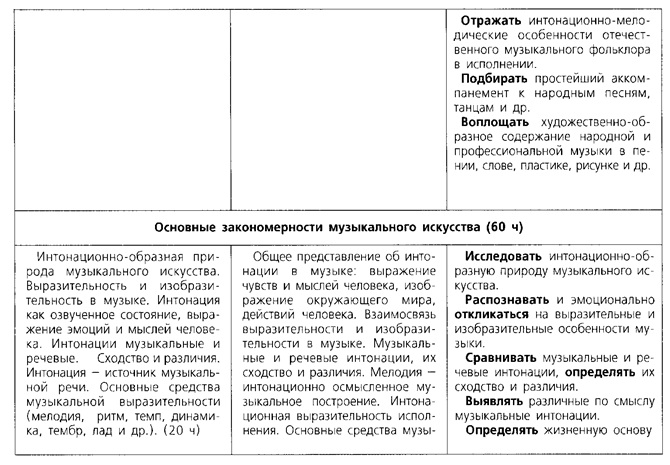 Основное содержание образования в Примерной программе представлено следующими содержательными линиями: «Музыка в жизни человека», «Основные закономерности музыкального искусства», «Музыкальная картина мира». Такое построение программы допускает разнообразные варианты структурирования содержания учебников, различное распределение учебного материала и времени для его изучения. Предусматривается резерв свободного учебного времени - 18 учебных часов на 4 учебных года. Этот резерв дает возможность разработчикам авторских программ наполнять указанные содержательные линии по своему усмотрению. В I классе сокращение часов осуществляется за счет резерва учебного времени. Музыка в жизни человека. Истоки возникновения музыки. Рождение музыки как естественное проявление человеческого состояния. Звучание окружающей жизни, природы, настроений, чувств и характера человека. Обобщенное представление об основных образноэмоциональных сферах музыки и о многообразии музыкальных жанров и стилей. Песня, танец, марш и их разновидности. Песенность, танцевальность, маршевость. Опера, балет, симфония, концерт, сюита, кантата, мюзикл. Отечественные народные музыкальные традиции. Народное творчество России. Музыкальный и поэтический фольклор: песни, танцы, действа, обряды, скороговорки, загадки, игры драматизации. Историческое прошлое в музыкальных образах. Народная и профессиональная музыка. Сочинения отечественных композиторов о Родине. Духовная музыка в творчестве композиторов. Основные закономерности музыкального искусства. Интонационнообразная природа музыкального искусства. Выразительность и изобразительность в музыке. Интонация как озвученное состояние, выражение эмоций и мыслей человека. Интонации музыкальные и речевые. Сходство и различие. Интонация — источник музыкальной речи. Основные средства музыкальной выразительности (мелодия, ритм, темп, динамика, тембр, лад и др.). Музыкальная речь как способ общения между людьми, ее эмоциональное воздействие. Композитор - исполнитель -слушатель. Особенности музыкальной речи в сочинениях композиторов, ее выразительный смысл. Нотная запись как способ фиксации музыкальной речи. Элементы нотной грамоты. Развитие музыки - сопоставление и столкновение чувств и мыслей человека, музыкальных интонаций, тем, художественных образов. Основные приемы музыкального развития (повтор и контраст). Формы построения музыки как обобщенное выражение художественнообразного содержания произведений. Формы одночастные, двух и трехчастные, вариации, рондо и др. Музыкальная картина мира. Интонационное богатство музыкального мира. Общие представления о музыкальной жизни страны. Детские хоровые и инструментальные коллективы, ансамбли песни и танца. Выдающиеся исполнительские коллективы (хоровые, симфонические). Музыкальные театры. Конкурсы и фестивали музыкантов. Музыка для детей: радио и телепередачи, видеофильмы, звукозаписи (CD, DVD). Различные виды музыки: вокальная, инструментальная; сольная, хоровая, оркестровая. Певческие голоса: детские, женские, мужские. Хоры: детский, женский, мужской, смешанный. Музыкальные инструменты. Оркестры: симфонический, духовой, народных инструментов. Народное и профессиональное музыкальное творчество разных стран мира. Многообразие этнокультурных, исторически с