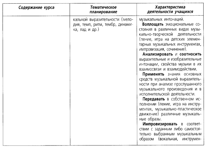 Основные виды учебной деятельности школьников Слушание музыки. Опыт эмоциональнообразного восприятия музыки, различной по содержанию, характеру и средствам музыкальной выразительности. Обогащение музыкальнослуховых представлений об интонационной природе музы ки во всем многообразии ее видов, жанров и форм. Пение. Самовыражение ребенка в пении. Воплощение музыкальных образов при разучивании и исполнении произведений. Освоение вокальнохоровых умений и навыков для передачи музыкальноисполнительского замысла, импровизации. Инструментальное музицирование. Коллективное музицирование на элементарных и электронных музыкальных инструментах. Участие в исполнении музыкальных произведений. Опыт индивидуальной творческой деятельности (сочинение, импровизация). Музыкальнопластическое движение. Общее представление о пластических средствах выразительности. Индивидуальноличностное выражение образного содержания музыки через пластику. Коллективные формы деятельности при создании музыкальнопластических композиций. Танцевальные импровизации. Драматизация музыкальных произведений. Театрализованные формы музыкальнотворческой деятельности. Музыкальные игры, инсценирование песен, танцев, игры-драматизации. Выражение образного содержания музыкальных произведений с помощью средств выразительности различных искусств.