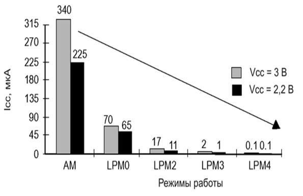 Семейство MSP430 разработано для приложений с ультранизким потреблением мощности и имеет различные режимы работы. Режимы работы учитывают три различные потребности: – ультранизкое потребление; – скорость и пропускную способность; – минимизацию потребления тока конкретной периферией. Типичное потребление тока микроконтроллерами семейства MSP430 показано на рисунке 1.6.
