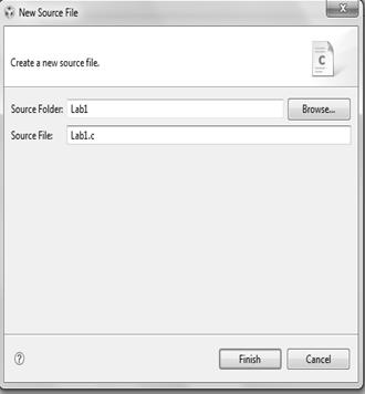 Рисунок 1.22 – Окно завершения конфигурации нового проекта После, необходимо создать файл в котором будет храниться исходный код программы, для этого необходимо перейти в меню File – New – Source File. Появится окно, изображенное на рисунке 1.23. Здесь необходимо указать директорию, где будет сохранен файл (Source Folder) и имя файла (необходимо указать расширение файла для этого после названия ставим точку и пишем латинскую литеру «.с») после – «Finish» и новый файл подключается к указанному в Source Folder проекту. После создание проекта его файлы будут отображаться в области С/С++ Project(рисунок 1.24). Окно области для написания программы будет отображаться под именем созданного файла (рисунок 1.25).