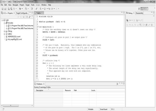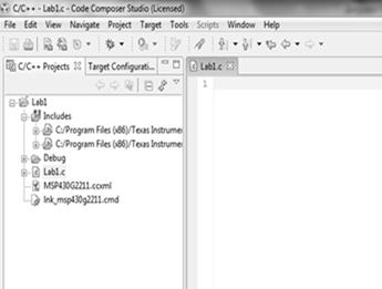 Тема: введение в среду разработки Code Composer Studio V4. Изучение принципа работы с портами контроллера MSP430G2211, MSP430F5438A. Цель работы: научиться программировать порты ввода вывода контроллера MSP430G2211, MSP430F5438A, изучить возможные способы осуществления программной задержки на выполнение команды. Ход работы. После установки необходимого программного обеспечения перед пользователем появляется окно программы, показанное на рисунке 1.15, где ее рабочее поле разделено на области: – С/С++ Projects – область программы, в которой отображается дерево (список) активных проектов; – Target Configuration – область в которой устанавливаются параметры подключения контроллера к конкретному ПК и его марка; – Debug – область в которой происходит запуск программы и ее отладка; – Disassembly – область в которой отображается код программы на языке ассемблер и адреса ячеек памяти к которым обращается данная программа; – Problems – область в которой отображаются программы после ее компиляции. В программе есть несколько режимов работы, отладка, настройка и написание программного кода. Для переключения между режимами используется двойную стрелку в верхнем правом углу окна. Переключение имеет вид изображенный на рисунке 1.16. После переключения в режим Debug программа примет вид (рисунок 1.17). Важно учесть что для работы с неактивными проектами и изменения конфигурации оборудования необходимо вернуться в режим С/С++. Для создания нового проекта необходимо зайти в меню File – New – CCS Project (рисунок 1.18)